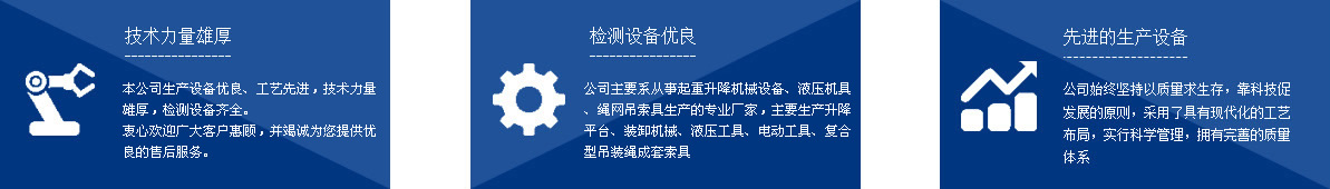 本公司系從事起重升降機械設備、液壓機具、繩網吊索具生產的專業廠家,主要生產千斤頂、液壓拉馬、軸承加熱器、升降平臺、裝卸機械、液壓工具、電動工具、復合型吊裝繩成套索具、高強纖維柔性吊裝帶、起重鏈條成套索具、橫梁吊具、注塑繩、軟梯、安全帶、安全網等幾大系列、上百種規(guī)格的產品,廣泛應用于電力、油田、大型鋼廠、機電、化工、航空、冶金、機械、鐵道、造紙、港口、建筑等領域。